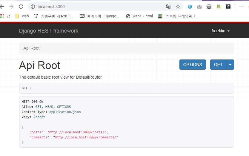 http://localhost:8000/ 에 접속하면 기존에는 posts api 밖에 없었지만 comments 까지 추가가 되 있는 것을 볼 수 있다.