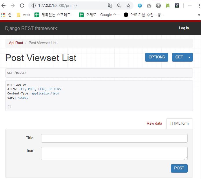 하단의 title 과 text 에 test 문구를 넣어주고 post 버튼을 눌러보자. post 를 누르면 post된 data만 보이게되고