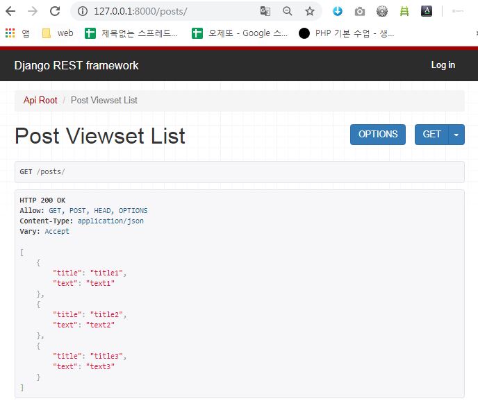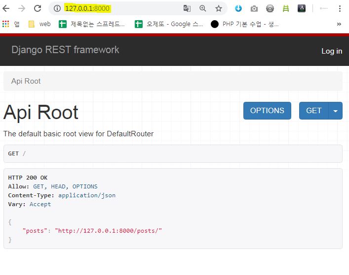 서버를 실행 후 위 주소로 들어가면 Default router에 의해서 접근할 수 있는 URL 인 http://127.0.0.1:8000/posts가 표시된다.