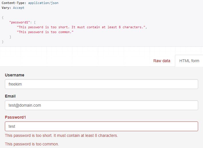 나같은 경우에는 migrate 이 잘못됫는지 email 이 field 가 없다는 오류가 났었다. allauth 에 뭔가 연관이 있는것 같기도 하고 무튼 다시migrate 을 해주고 실행을 하니 정상 동작 했으나 password 를 너무 짧게 썻었는지 아래의 결과를 얻었다. 기본적으로 비밀번호 길이에 대한 예외처리가 들어가 있나보다. 편하다. 그리고 단순한 password 에 대해서도 예외처리가 되어 있나보다.