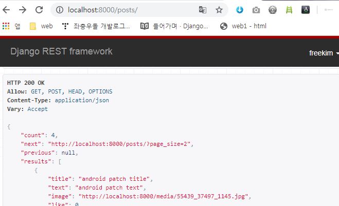 기존에는 단순 results 의 List 만을 가지고 안드로이드의 retrofit 을 사용해서 restAPI 를 호출 하였지만 pagination 을 활용 하니 json 의 구조가 바뀌었다. 안드로이드에 바뀐 구조를 받아오는 restfit 예제도 실습한뒤에 포스팅 하겠다.
