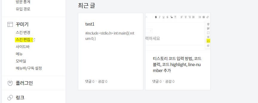티스토리 블로그에 코드를 공유 하는 글들을 보면 위의 예시 처럼