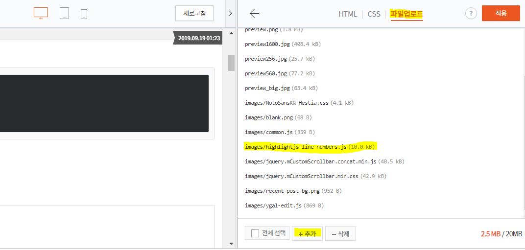 2. 다운받은 js 파일을 위에 highlight 적용할때 사용한 [html편집] 으로 들어가