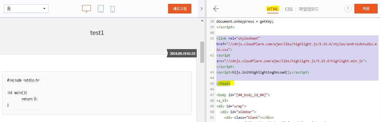 3. js 가 추가가 되었으면 아래의 코드를 highlight 를 적용했을 때와 동일하게 </head> 위에 복사 붙여넣기 해준다.
