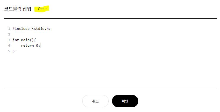 아래와 같은 형식으로 보이게 되고 완료를 누르면 최종적으로 코드가 코드블럭의 기본 테마 형식으로 보이게 된다.